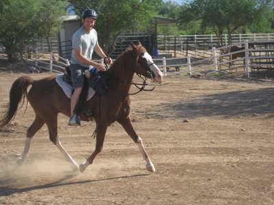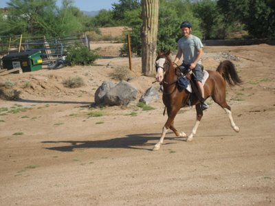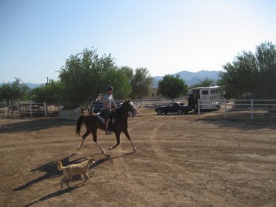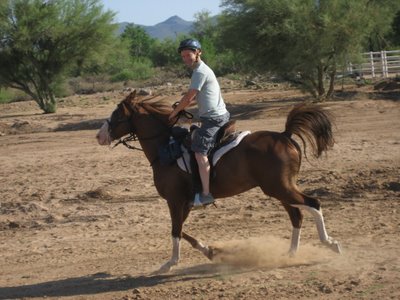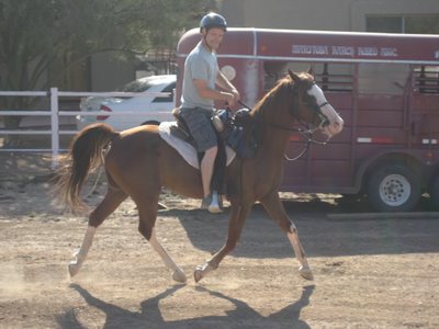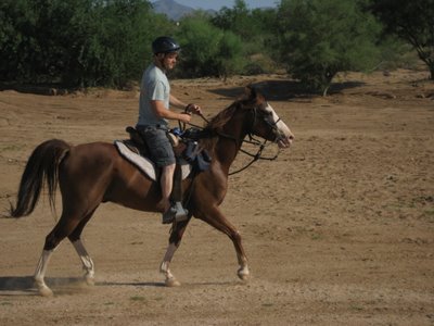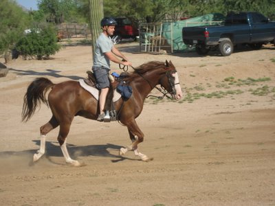 Well, I'm finally back in the Far saddle! I came home last night to new injuries - which I've decided are as a result of a fall on the caliche. He scraped both knees up pretty good - the left one is quite deep. But he is sound, and he got a walking ride last night and a trotting ride this morning. He's definitely got Far in the belly, which brough quite a smile to my face!